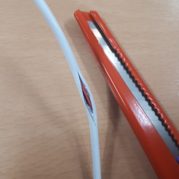 실제로 선을 자를 때는 가능하면 다음과 같이 선의 방향에 따라서 세로로 칼을 그어 피복을 벗기는 것이 깔끔합니다.
