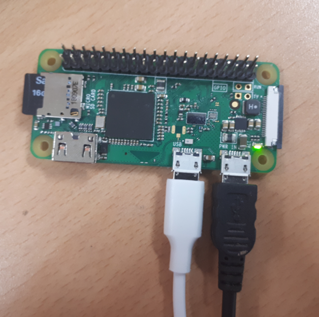 저는 라즈베리파이(Raspberry Pi) Zero W 모델을 사용하는데, 다음과 같이 USB OTG 포트(port)에 data-only 케이블을 연결하여 사용하고 있습니다. 이렇게 하게 되면 전원이 중복되어 공급되지 않고 안전하게 USB 보드 개발을 진행할 수 있습니다.