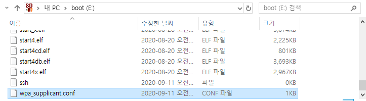 Mini HDMI 케이블과 USB OTG 케이블을 가지고 있으신 분들은 직접 모니터와 키보드를 연결하여 사용할 수 있습니다. 다만 그러한 케이블이 없다면 SSH로 라즈베리파이에 접속하여 사용할 수 있습니다. 라즈베리파이에 SSH로 접속하기 위해서는 가장 먼저 boot 폴더에 ssh라는 이름의 파일을 만들어 주어야 합니다. 이로써 라즈베리파이가 부팅될 때 SSH 포트가 열리게 됩니다.