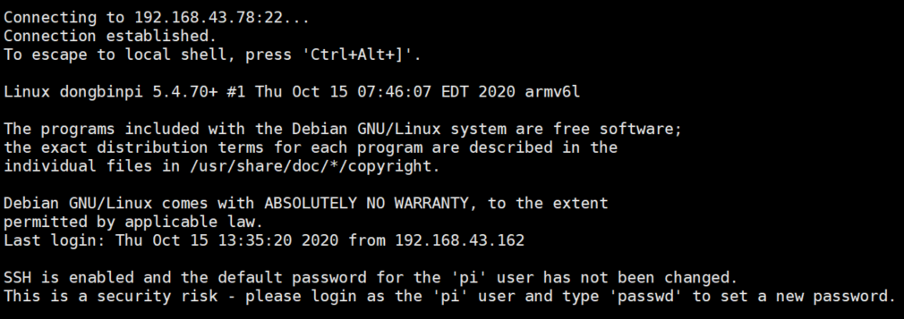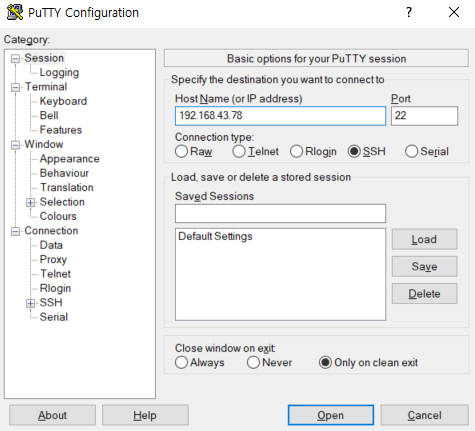 결과적으로 컴퓨터에서 SD 카드를 제거한 뒤에 라즈베리파이에 꽂아서 부팅하시면 됩니다. 파워(power) 케이블을 연결하면 자동으로 부팅이 진행됩니다. 이후에 SSH로 접속하여 사용하면 됩니다. 접속하고자 하는 컴퓨터와 라즈베리파이를 동일 아이피 대역에 둔 뒤에 Advanced IP Scanner와 같은 프로그램을 이용해 라즈베리파이의 IP 주소를 찾아서 접속하면 됩니다. Putty나 XShell 같은 프로그램을 이용해 접속하면 됩니다. 예를 들어 라즈베리파이의 IP 주소가 192.168.43.78로 나온다면 다음과 같이 입력하여 접속할 수 있습니다.