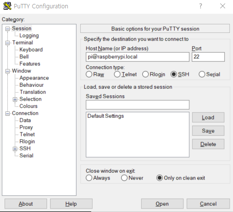 기본적으로 마찬가지로 boot 폴더에 ssh라는 이름의 파일을 생성해 준 뒤에, Raspberry Pi에 SD 카드를 꽂습니다. 그리고 Raspberry Pi 데이터 케이블을 PC에 연결합니다. putty와 같은 유틸리티를 활용하여 pi@raspberrypi.local에 접속합니다.