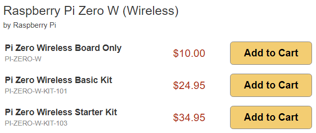 Raspberry Pi Zero W는 Amazon이나 Canakit과 같은 사이트를 통해 구매할 수 있습니다. 또한 일반적인 경우 보드(Board)만 구매하는 경우에는 1개씩만 구매할 수 있도록 하는 경우가 많습니다. 사실 10달러($)에 이 정도의 보드를 살 수 있다는 것 자체가 매우 좋은 조건이긴 합니다.