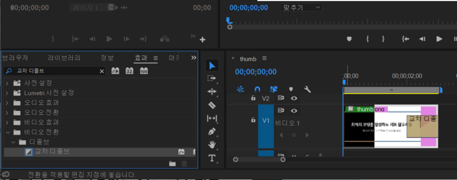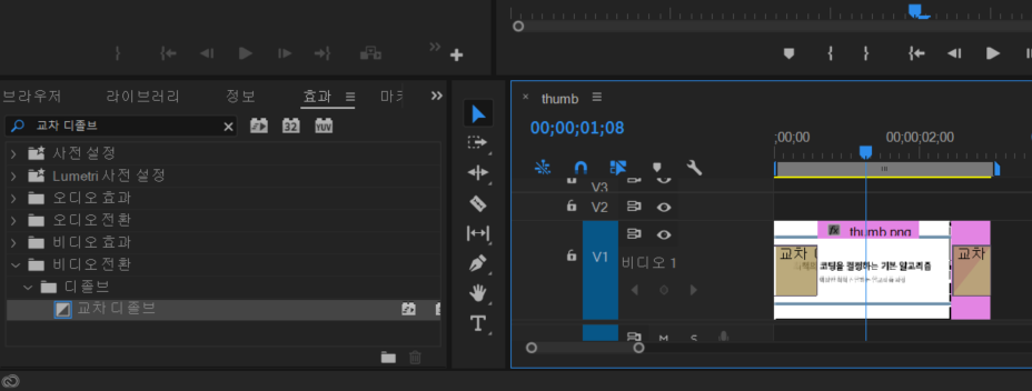 이후에 효과(effect)에서 교차 디졸브(cross dissolve)를 검색하여 드래그 앤 드롭(drag & drop)하여 사진의 끝부분에 놓는다. 이러면 바로 페이드 아웃(fade-out)이 적용된다.