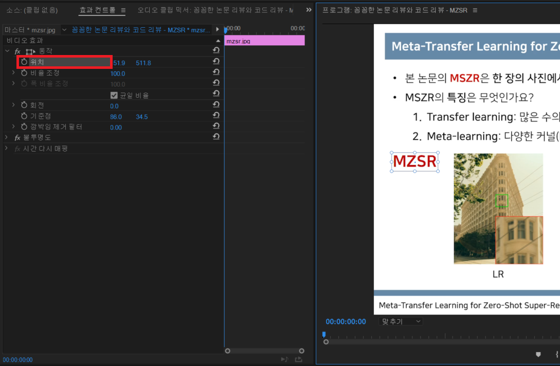필자의 경우 아래 사진에서 볼 수 있듯이 동영상을 촬영할 때 PPT에 내용을 잘못 기재하여 MZSR을 MSZR이라고 적었다. 다만 이것 때문에 동영상을 다시 촬영하는 것은 수고스럽기 때문에 MZSR이라고 적힌 이미지를 그 위에 올려놓고자 하는 것이다. 이때 이미지를 클릭한 뒤에 [효과 컨트롤]에 가서 [위치] 탭을 클릭한다. 이후에 직접 크기나 위치를 손쉽게 드래그 & 드롭하여 조절할 수 있게 된다.