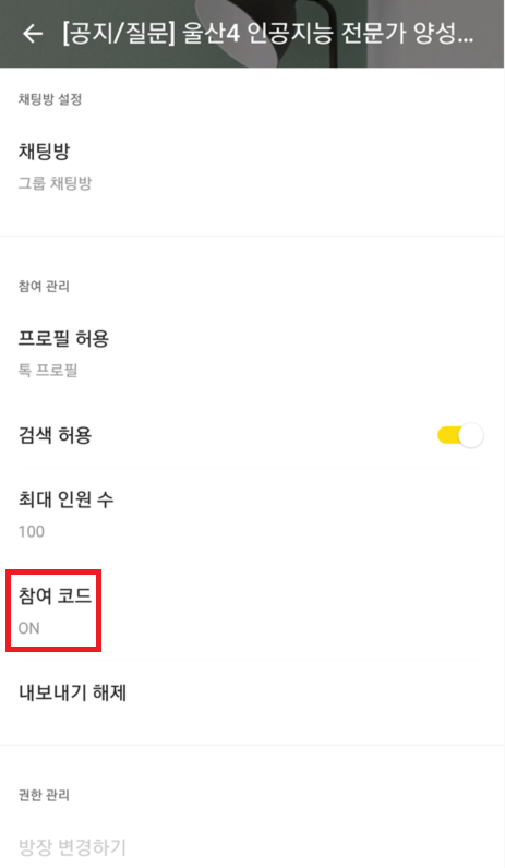 오픈채팅방에 아무나 들어오면 안 되고, 내가 허락한 사람만 참여하도록 만들고 싶다면 참여 코드를 설정하면 된다. 참여 코드를 설정할 때는 가장 먼저 다음의 버튼을 누른다.