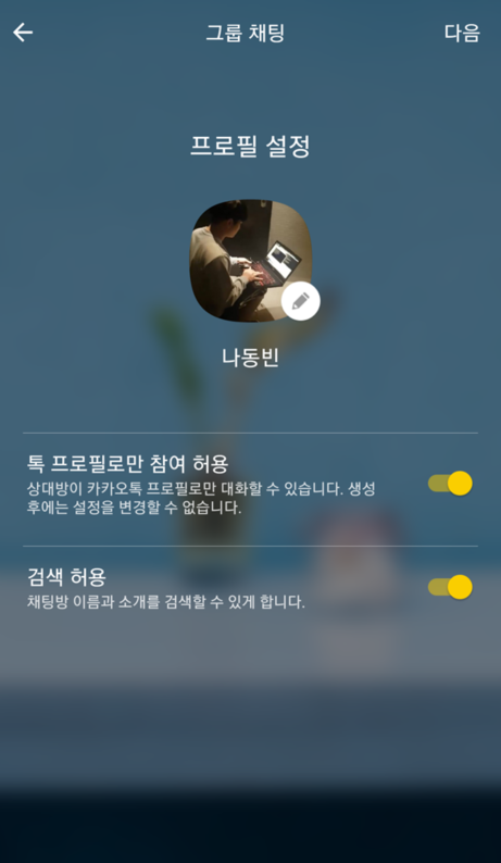 이후에 방장으로서 자신의 프로필을 설정한다. 그리고 [톡 프로필로만 참여 허용] 버튼을 누르면 오픈채팅에 참가하는 사람들이 자신의 공식 카카오톡 프로필로만 채팅에 참여할 수 있게 된다. 또한 [검색 허용] 설정을 하면 오픈채팅방의 이름과 소개를 검색하여 방에 참여할 수 있게 된다.