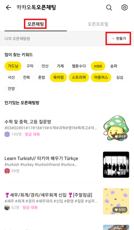 오픈채팅 채널로 들어오면 다른 사람이 만든 채팅방을 검색하여 들어갈 수도 있으며 혹은 내가 직접 오픈채팅방을 만들 수 있다. 여기에서는 [만들기] 버튼을 눌러 오픈채팅방을 만들어 보자.