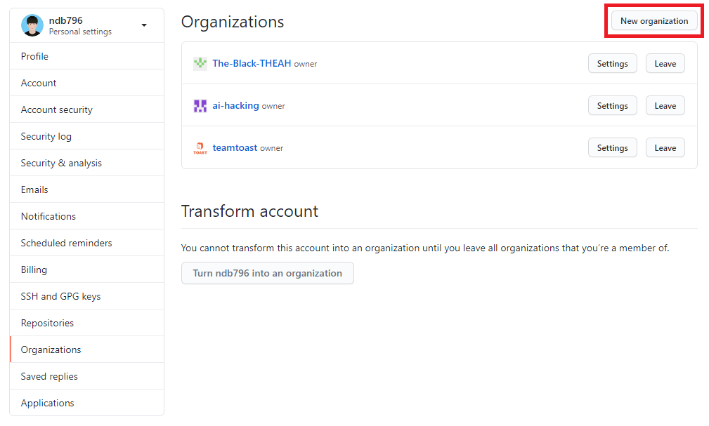 [New organization]을 눌러서 새로운 조직(organization)을 추가한다.