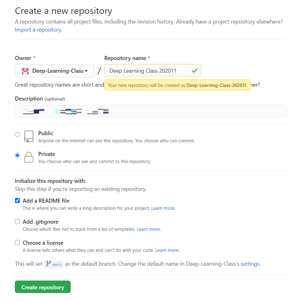 필자는 다음과 같이 하나의 저장소를 만들었다. 아무나 볼 수 없도록 Private으로 설정했다.