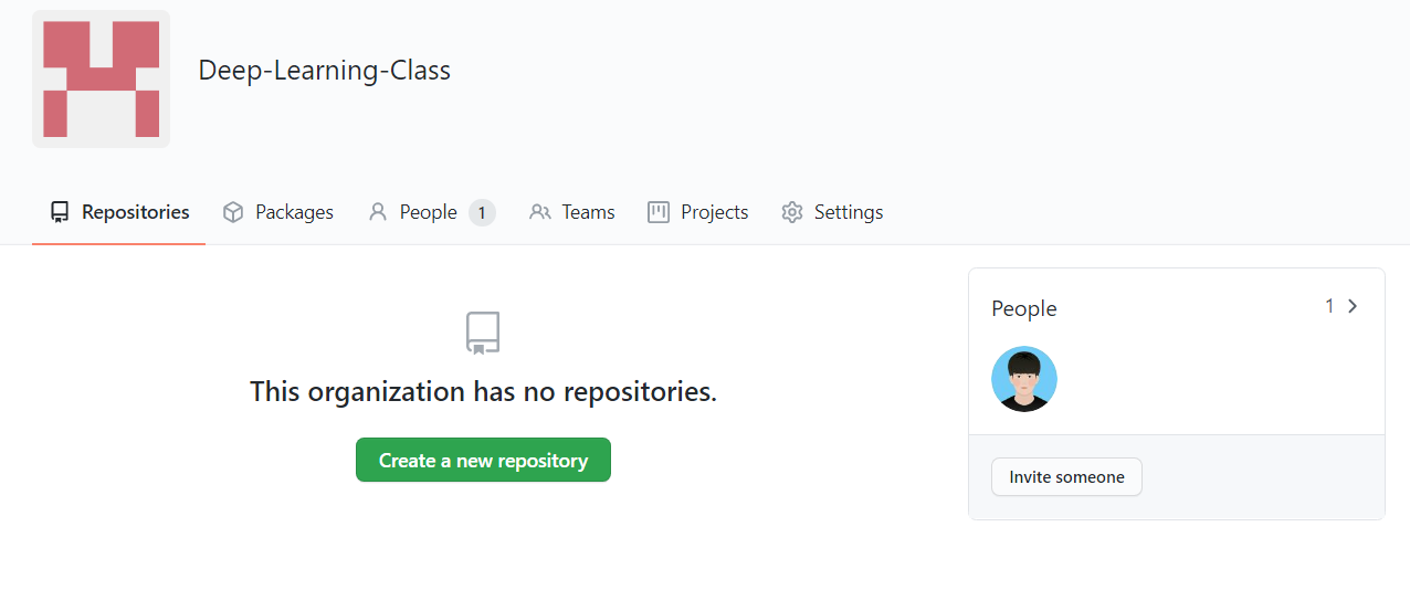 결과적으로 조직(organization) 생성을 완료하면 다음과 같은 페이지가 등장한다. [Create a new repository] 버튼을 눌러 하나의 저장소를 생성하자.