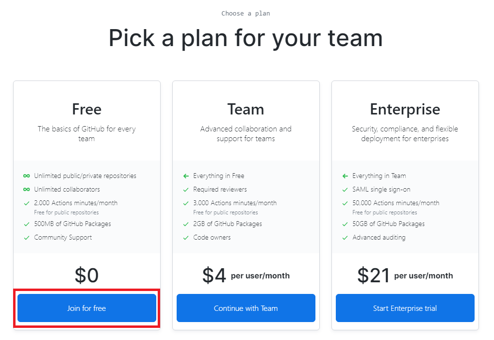 이후에 팀(team)을 위한 가격 플랜을 설정할 수 있다. 앞서 언급했듯이 단순히 특정 사용자만 내 코드를 볼 수 있도록 설정하기 위해서는 무료(Free) 플랜으로 충분하다. 따라서 [Join for free] 버튼을 클릭하자.