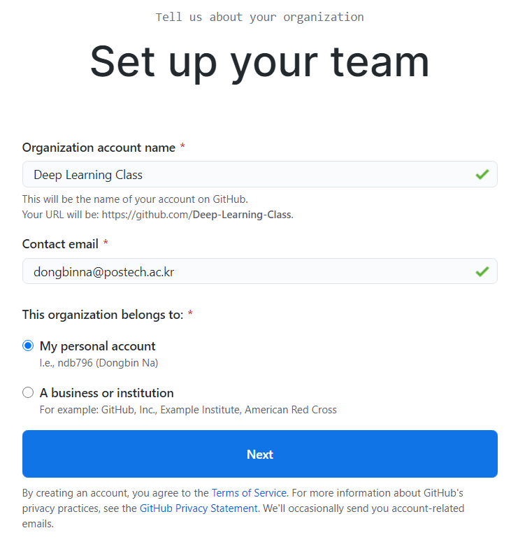 이후에 다음과 같이 팀에 대한 기본적인 설정을 할 수 있다. 필자는 Deep Learning Class라는 이름으로 조직 이름을 설정했으며 대표 이메일로는 학교 이메일을 넣었다.