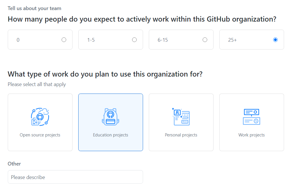 이후에 조직(organization) 관련 정보를 작성할 수 있다. 필자의 경우 교육 목적의 저장소이기 때문에 [Education projects]를 선택했고, 25명 이상의 사람이 조직에 포함될 수 있다고 기재했다.