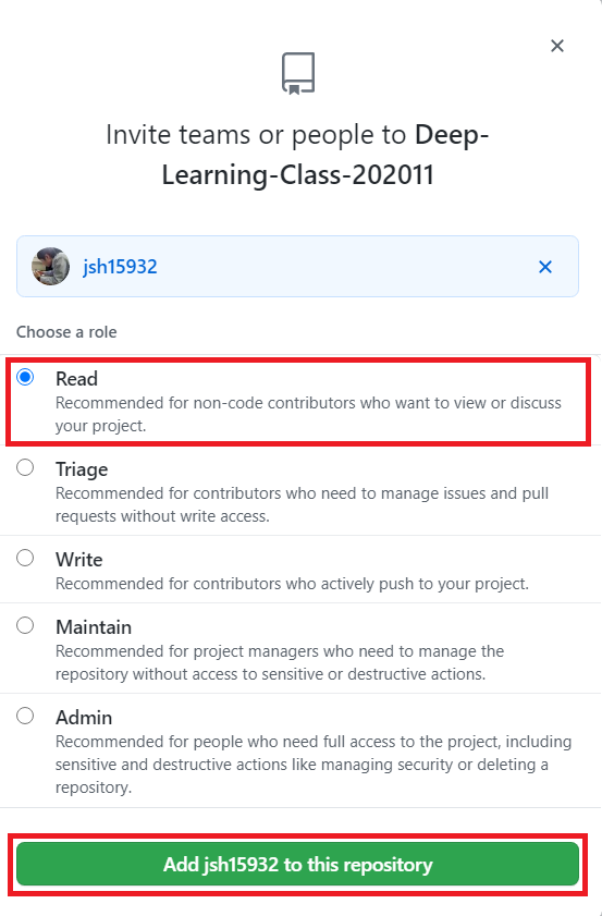 다음과 같이 GitHub 가입자를 아이디로 검색하여 권한을 부여할 수 있다. 이때 기본적으로 outside collaborator로 멤버가 추가되며, 더불어 [Read] 권한으로 부여하게 되면 해당 사용자는 소스코드를 볼 수 있지만 commit 등은 불가능하다. 따라서 의도했던 대로 코드에 대한 보기 권한만 부여하는 것이다.