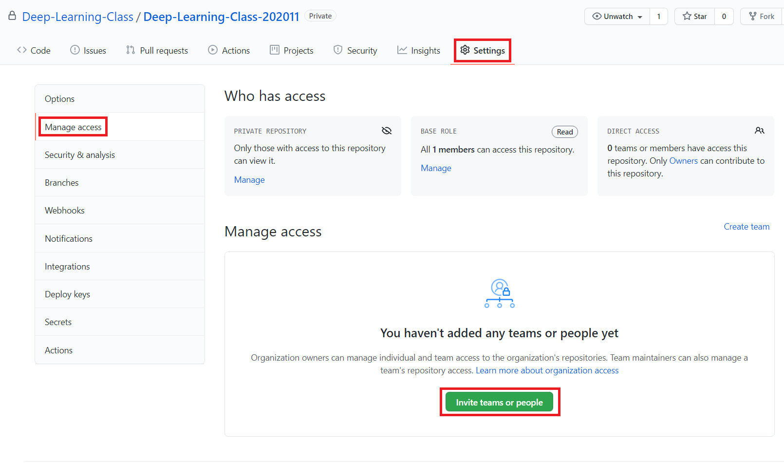 이후에 해당 저장소(repository)의 [Settings] - [Manage access] 탭에 들어가 구성원을 설정할 수 있다. [Invite teams or people] 버튼을 눌러서 한 명의 구성원을 추가해보자.
