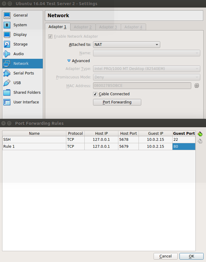 이제 Guest는 Network 설정을 진행합니다. 기본적으로 네트워크 어댑터를 NAT에 연결합니다. 또한 [Connect Network Adapter]에 정상적으로 체크되어 있는지 확인합니다. 이 과정에서 Guest의 아이피 주소를 확인하기 위해 ifconfig 명령어를 사용해 볼 필요가 있습니다. 결과적으로 다음과 같이 포트포워딩을 진행합니다. 간단히 웹 서버도 같이 개방하고자 합니다.
