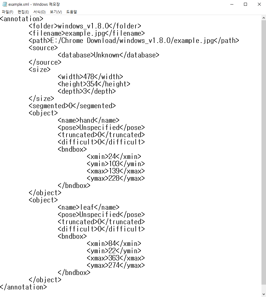 결과적으로 이미지 파일이 존재하는 위치에 다음과 같이 .xml 파일이 생성된다. 파일의 형식은 PASCAL VOC 형식을 따른다. 내용을 확인해 보면 각각 Object마다 <object> 태그를 가지며, Bounding Box의 위치를 4가지 파라미터로 가리키는 것을 알 수 있다. (xmin, ymin, xmax, ymax)
