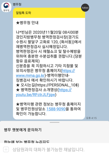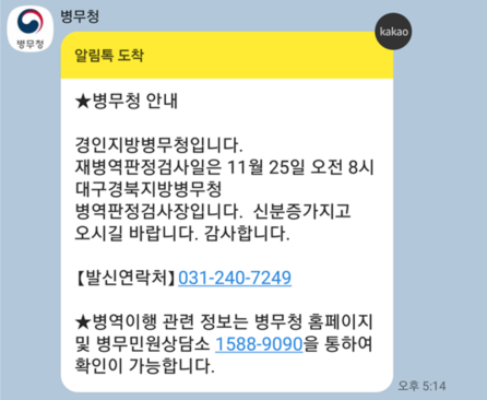 병역 의무가 있는 남성은 다음과 같이 병무청으로부터 신체검사를 받으러 오라는 안내를 받게 됩니다. 단순히 우편으로 통보가 오는 것은 아니고 카카오톡으로 알려주네요. 아무튼 저는 2015년 대학교 1학년 시절에 신체검사를 받았습니다. 그로부터 5년이 지난 지금 다시 병역판정검사를 받으러 오라고 메시지를 받게 된 상황입니다. (재병역판정검사)