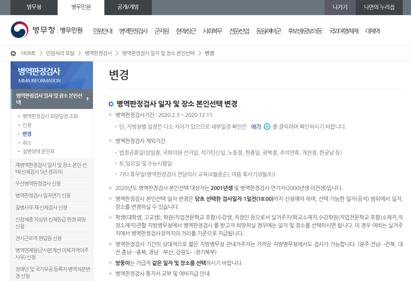 ▶ 병역판정검사 일자 및 장소 변경: mwpt.mma.go.kr/caisBMHS/index_mwps.jsp?menuNo=22018