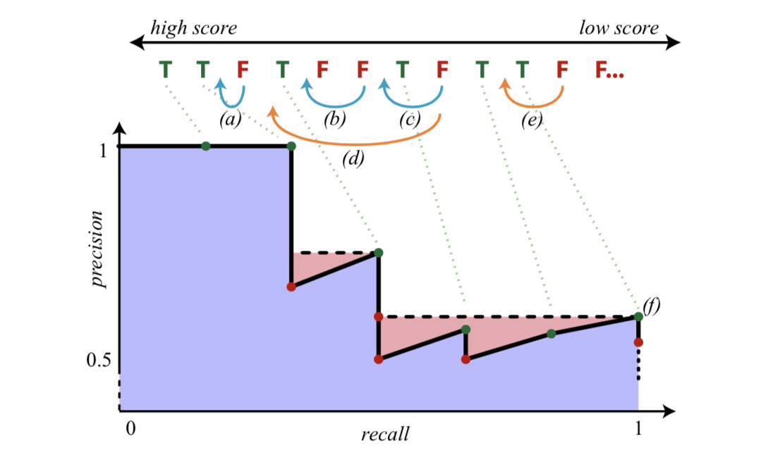 앞서 말했듯이 Precision과 Recall은 반비례적인 관계를 가지기 때문에 Average Precision을 대신 이용할 수 있다. Average Precision은 대략 다음과 같이 생겼다. Precision-Recall 그래프를 단조 감소 그래프 형태로 바꾸어 넓이를 구할 수 있다. 그래서 일반적으로 논문에 가장 많이 등장하는 mAP(Mean Average Precision)이 여기에서 나온 개념이다.