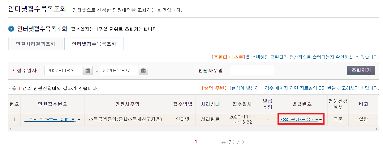 신청 이후에는 다음과 같이 [인터넷접수목록조회] 탭에 들어가서 [발급번호]를 클릭하여 확인할 수 있습니다.