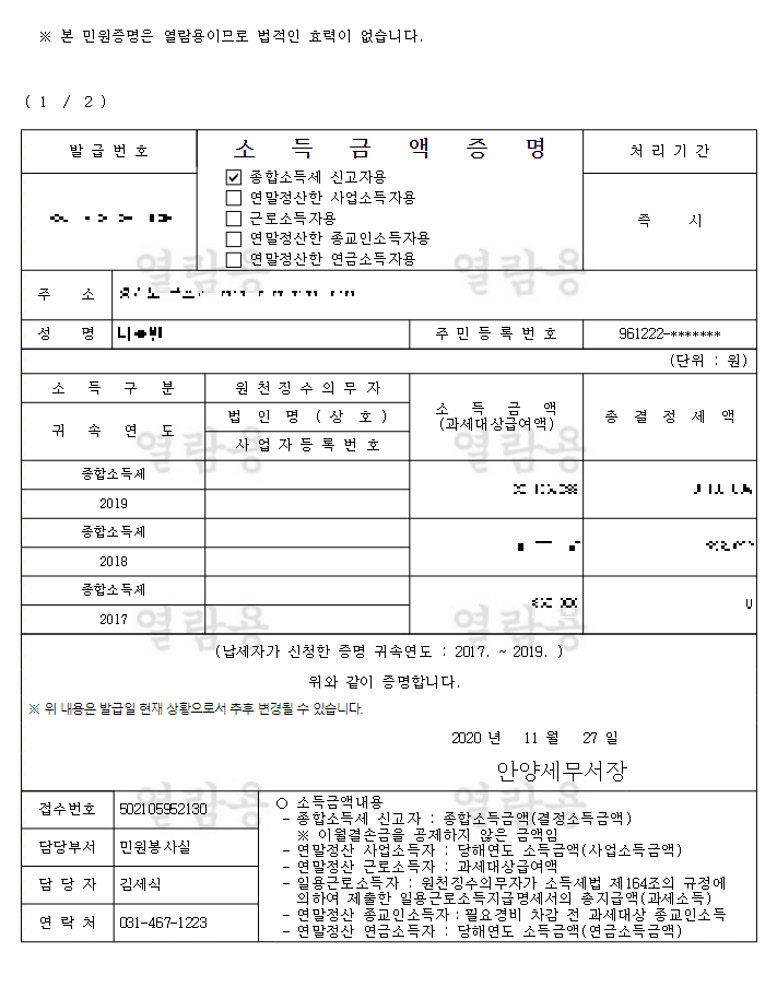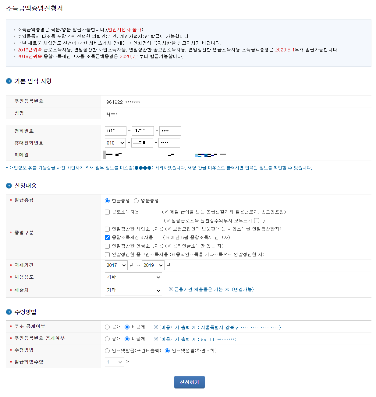 이때 다음과 같이 어떤 유형으로 발급을 신청할 것인지 설명하여 발급을 진행하시면 됩니다. 저는 [종합소득세 신고자용]으로 2017년부터 2019년까지의 소득에 대하여 금액을 확인했습니다.