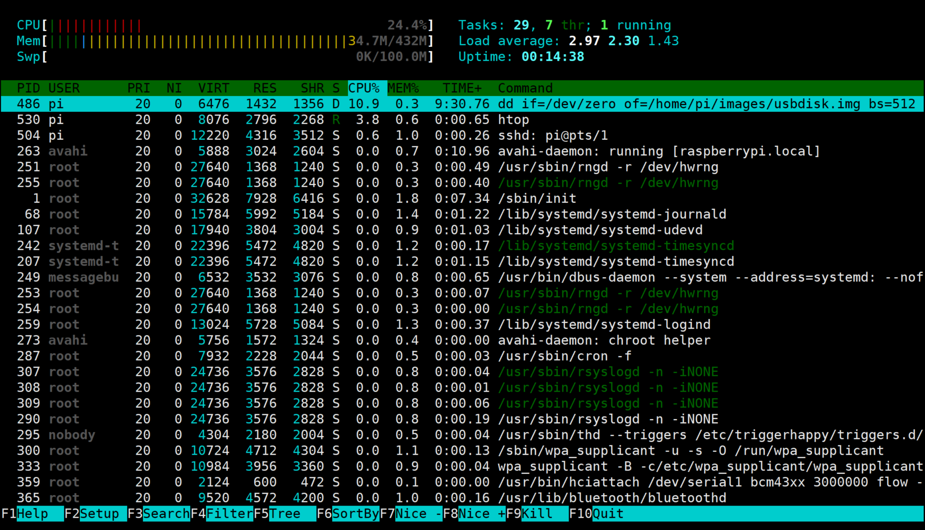 이때 특정 프로세스를 종료하고 싶다면 스페이스 바(Space Bar)를 눌러 원하는 프로세스들을 선택한 뒤에 F9을 눌러 종료하면 됩니다. 또한 F4를 누르면 문자열을 입력하여 검색어 필터링(filtering)을 수행할 수 있습니다.