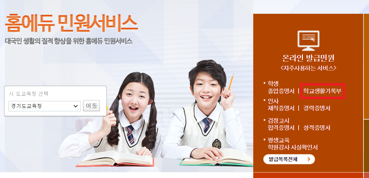 고등학교 생활기록부는 나이스(NEIS) 대국민서비스 사이트에 방문하여 발급받으실 수 있습니다.