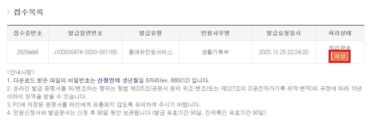 다음과 같이 [저장] 버튼을 눌러 생활기록부를 다운로드받을 수 있습니다.