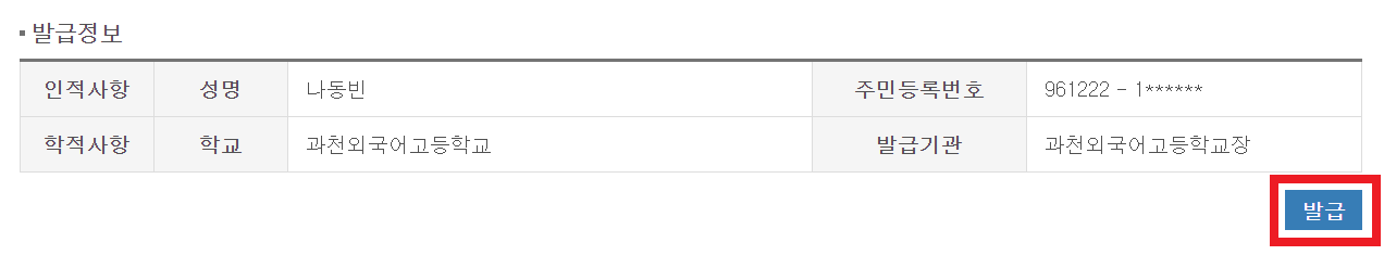 이어서 [발급] 버튼을 눌러 발급받을 수 있습니다.