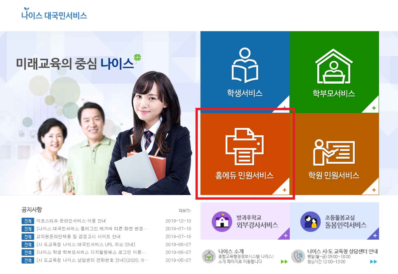 나이스 대국민서비스 사이트에 방문한 이후에는 [홈에듀 민원서비스] 링크로 접속합니다.