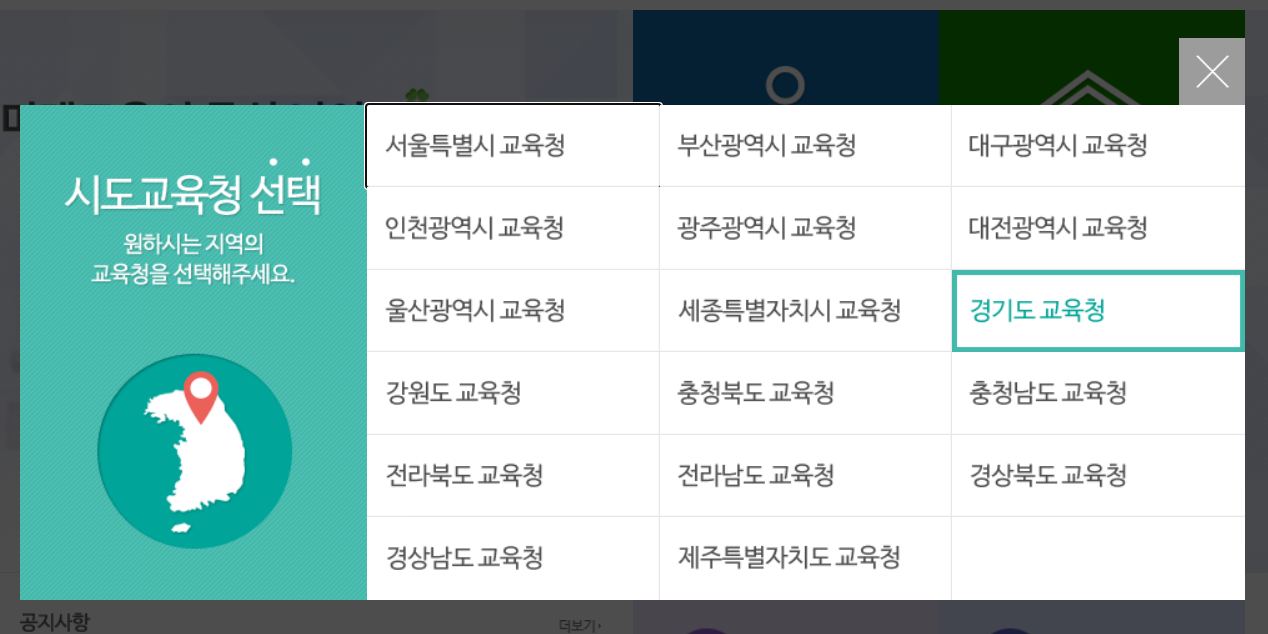 이후에 자신의 교육청을 선택합니다. 저는 경기도 소재인 고등학교에 다녔기 때문에 [경기도 교육청] 버튼을 클릭하였습니다.