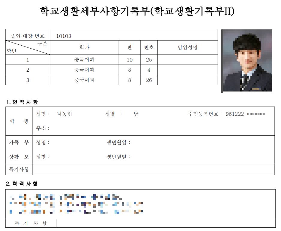 참고로 문서에는 비밀번호가 걸려 있는데, 비밀번호는 자신의 생년월일 6자리입니다. 필자는 Foxit과 같은 PDF 파일 수정 프로그램을 사용하여 담임 선생님의 성명이나 주소 등은 지웠습니다.
