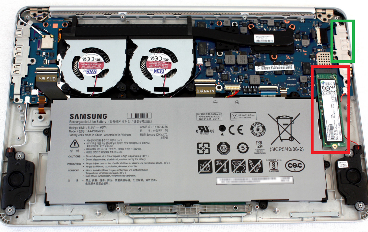아래 사진은 삼성 Always 9 노트북 기종의 하판 예시다. (내가 수리를 맡겼던 기종이기도 하다.) 여기에서 빨간색 박스를 친 부분이 SSD이고, 초록색 박스로 친 부분이 USB 및 배터리 포트가 있는 부분이다. 필자의 경우에는 이 USB 포트 부분으로 사과즙이 들어가서 쇼트가 났던 것으로 보인다.