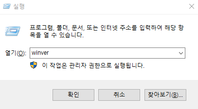 윈도우 키 + R을 눌러 [실행] 창을 열고, winver를 입력한다.