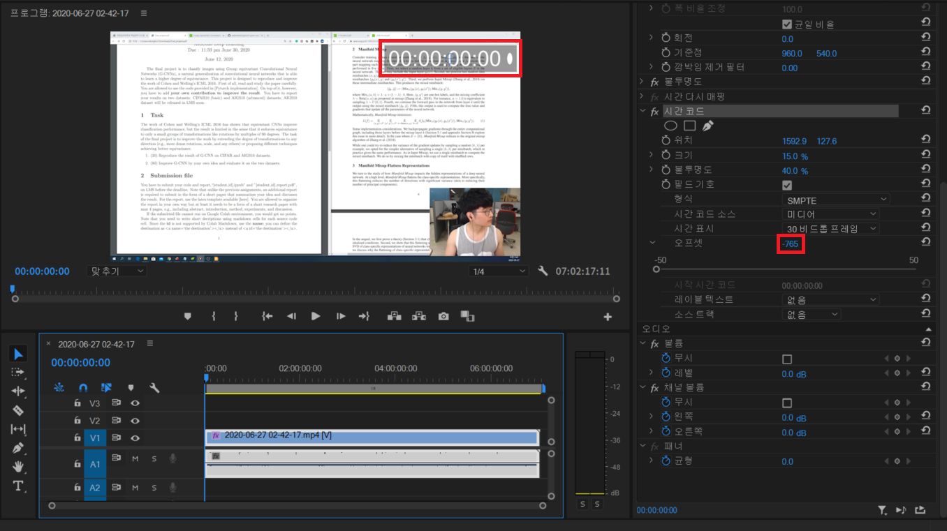 [시간 코드] 효과를 넣은 뒤에는 화면 내 적절한 위치로 옮겨주시고, 필요하다면 오프셋(offset)을 설정하여 시간 코드의 시작 시각이 00시 00분 00초가 될 수 있도록 합니다.
