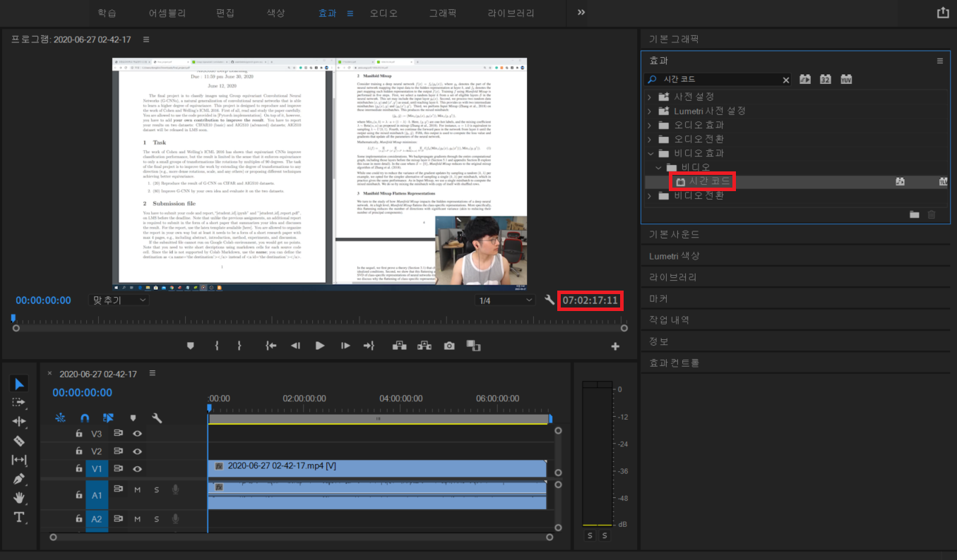 필자는 7시간짜리 타임랩스 영상을 프리미어로 불러왔습니다. 참고로 시간을 압축한 동영상을 제작하고자 하는 경우 원래의 시간이 어느 정도인지 알기 어렵기 때문에 [시간 코드] 효과를 넣어주는 것이 좋습니다. 따라서 [효과] 탭에서 [시간 코드] 효과를 선택해 넣어주겠습니다. 이를 통해 전체 클립의 길이에서 어느 정도까지 재생되었는지 동영상 화면에 출력할 수 있습니다.