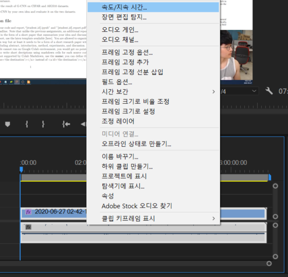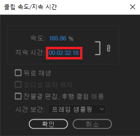 이어서 시간을 압축하고 싶다면 [속도/지속 시간] 란에 들어가서 전체 동영상 속도를 줄이면 됩니다. 프리미어 프로에서는 특정한 비율만큼 속도를 줄일 수도 있으며, 혹은 특정한 길이를 가지도록 알아서 빠르기가 조절되도록 만들 수도 있습니다.