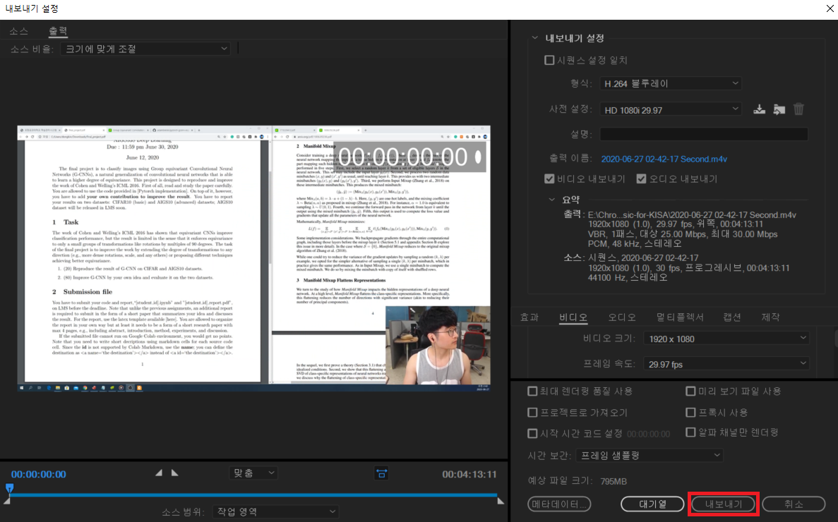 필자가 사용하고자 하는 음악 파일은 3분가량이기 때문에, 사실 4분의 길이보다 더 많이 줄여야 합니다. 그러므로 일단 100배까지만 빠르게 설정한 뒤에 동영상을 내보내기 하겠습니다. [내보내기] 창을 열어 다음과 같이 동영상을 만들어 주겠습니다. 필자의 경우 원본 동영상의 길이가 7시간이므로 [내보내기]를 수행하는 데에만 30분가량의 시간이 소요되었습니다.