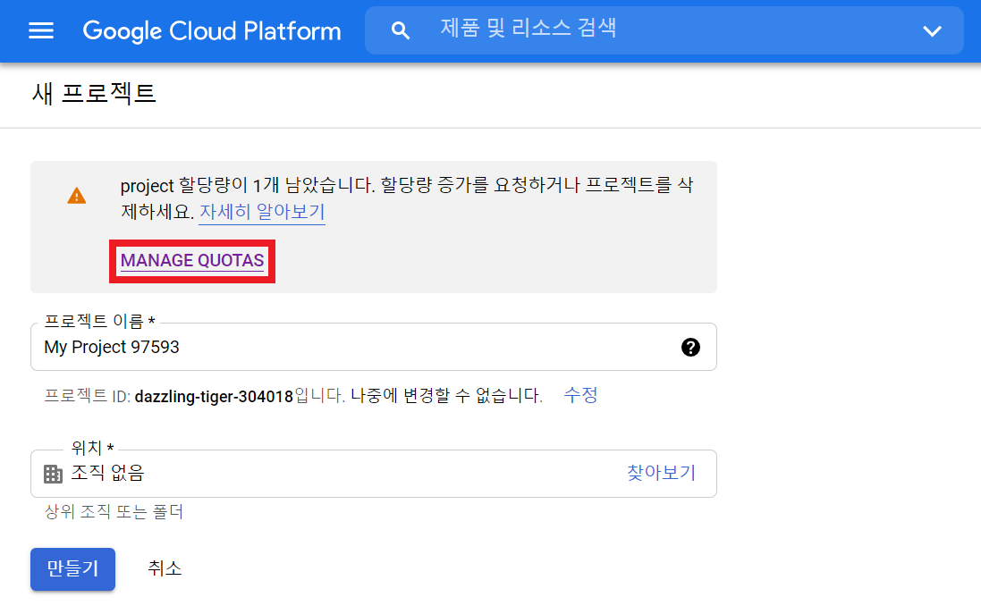 Google Cloud Platform의 경우 프로젝트 할당량이 정해져 있다. 일반적인 개발자의 경우 프로젝트(project)의 수 자체가 많지 않으므로 문제가 없지만, 프로젝트를 많이 운영하는 회사의 경우에는 GCP 프로젝트의 수를 많이 만들 필요가 있다. 예를 들어 다음과 같이 할당량이 부족하므로 할당량 증가를 요청하라는 메시지가 나오는 것을 알 수 있다.