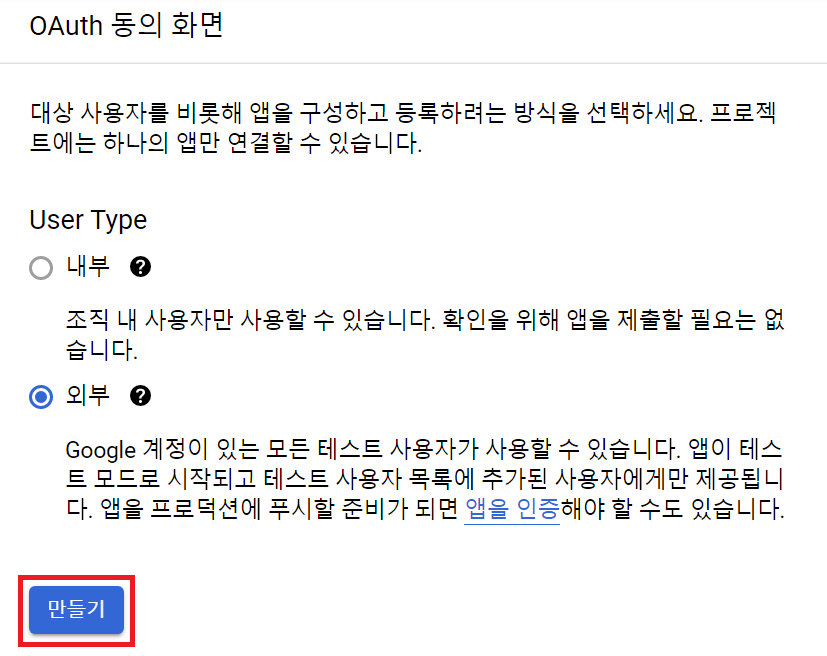 동의 화면 설정을 할 때는 사용자(user) 타입을 설정할 수 있는데, 필자의 경우 스스로 개인 유튜브 채널의 댓글을 관리하기 위해 사용할 것이다. 그래도 [외부]를 선택하는데, 필자의 경우 G Suite 사용자가 아니기 때문이다.