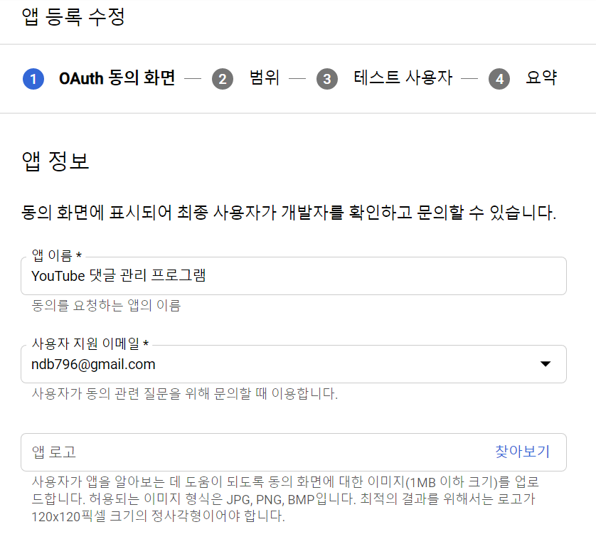 유튜브 채널 댓글 관리를 위해 YouTube Data API에서 YouTube 댓글 관련 범위를 선택한다. 구체적으로 youtube.force-ssl을 이용하면 된다.