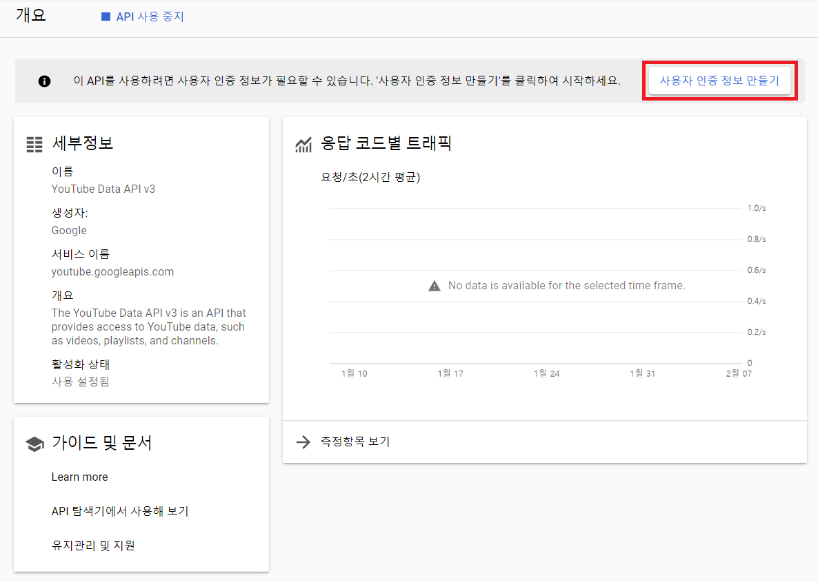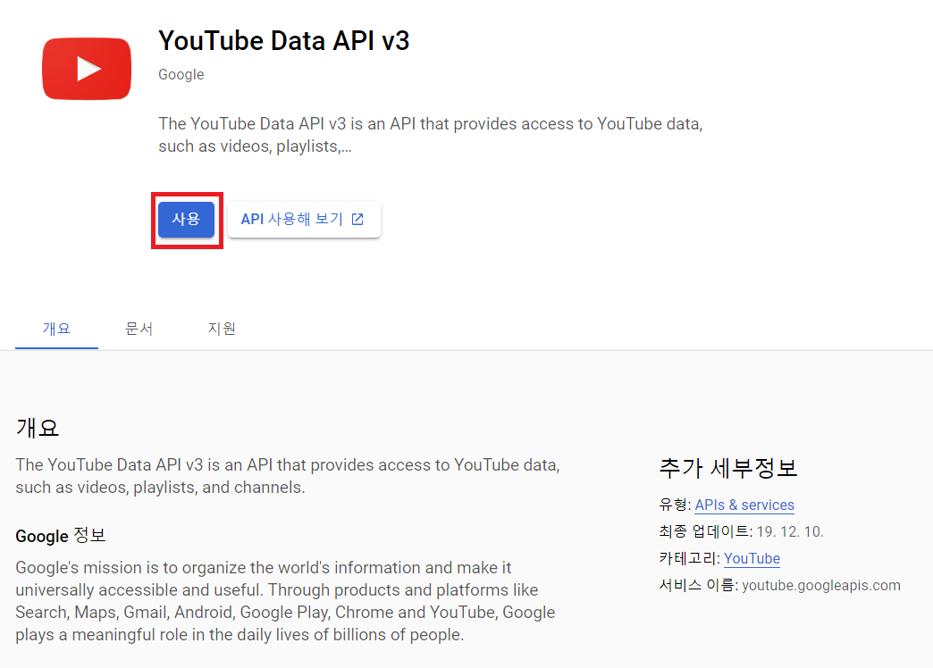 구글 클라우드 플랫폼은 매우 많은 수의 API를 제공한다. 따라서 프로젝트를 생성한 이후에는 YouTube Data API를 검색하여 이를 [사용] 설정할 필요가 있다.
