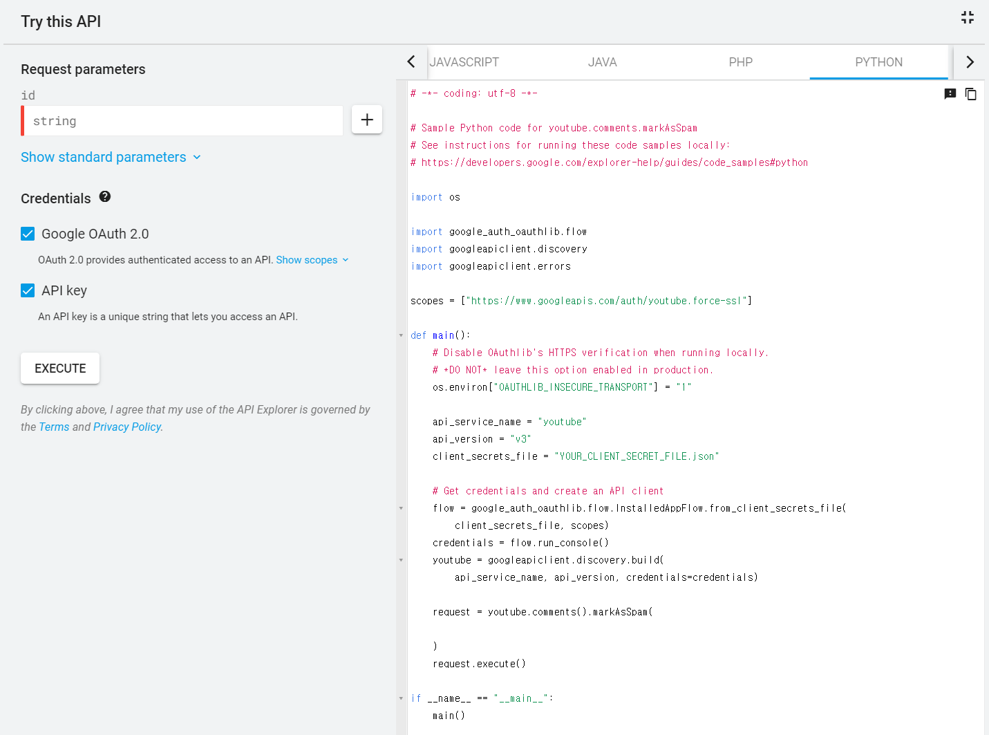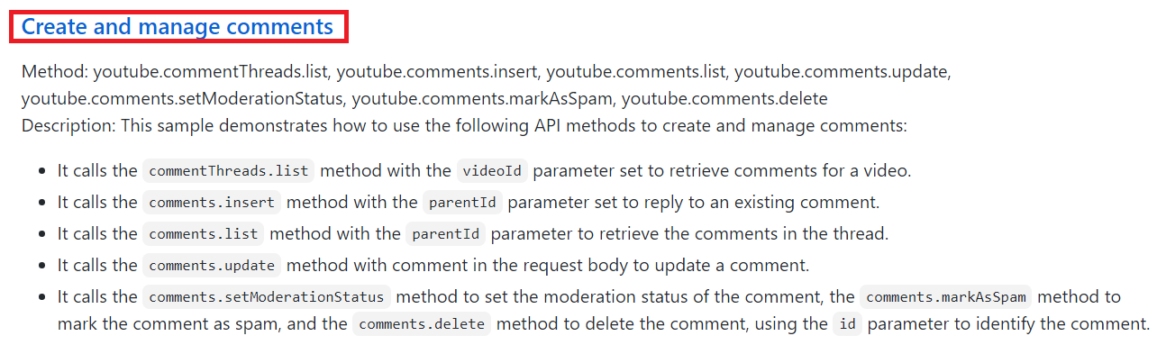 파이썬 사용자를 위한 YouTube Data API의 공식 코드를 확인할 수 있다. 예를 들어 API를 이용해 댓글을 관리하고자 할 때는 [Create and manage comments] 링크에 들어가 예제를 확인해 볼 수 있다.