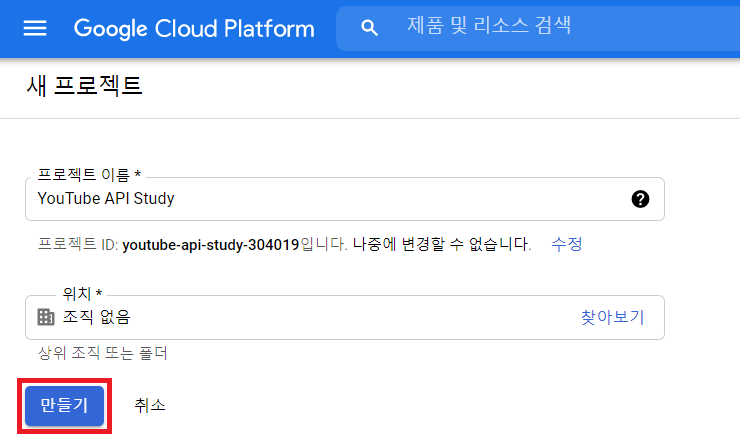 YouTube Data API를 사용하기 위해 가장 먼저 구글 클라우드 플랫폼에서 새 프로젝트를 생성해 보자.