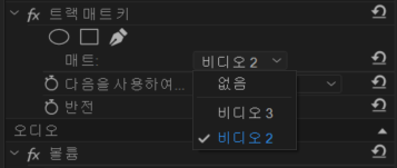 이제 비디오를 누른 뒤에 [효과 컨트롤] 창에서 [트랙 매트 키]를 찾아 [매트]를 [비디오 2]로 선택해 주세요.