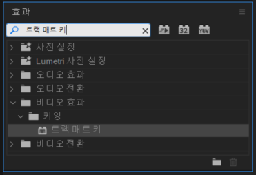 이제 [트랙 매트 키] 효과를 검색합니다. 이걸 비디오 클립에 적용합니다. (원 도형이 아닌, 비디오 클립에 적용해주세요.)