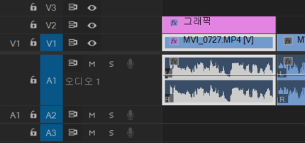 결과적으로 비디오에 [트랙 매트 키] 효과가 적용되었습니다. 또한 저의 경우에는 원 도형(그래픽)이 V2 라인에 있는 것을 알 수 있습니다.