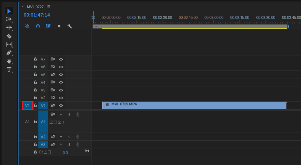 아래 사진을 확인해보자. 비디오 V1에 대해서만 소스 패치가 적용되어 있다. 이 경우 오디오가 존재하는 동영상을 불러와도 다음과 같이 비디오만 불러와 지며 오디오가 없는 것처럼 처리되는 것을 알 수 있다.