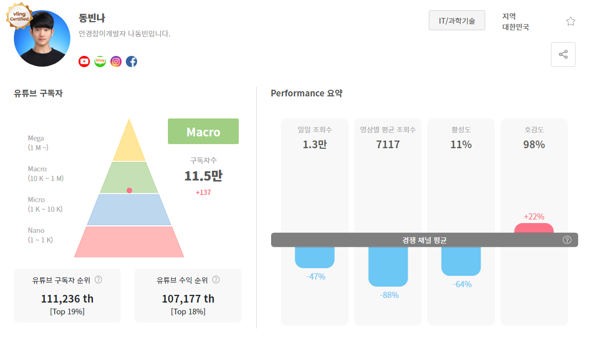 블링도 크리에이터 정보 검색 사이트다. 이 사이트는 크리에이터 본인인 경우 광고 단가 정보를 무료로 볼 수 있도록 해준다. 기본적인 정보들은 제공해준다. 필자의 경우 강의 영상을 위주로 올리기 때문에 조회수나 댓글 수는 적지만, 좋아요 비율은 좋은 편이다.